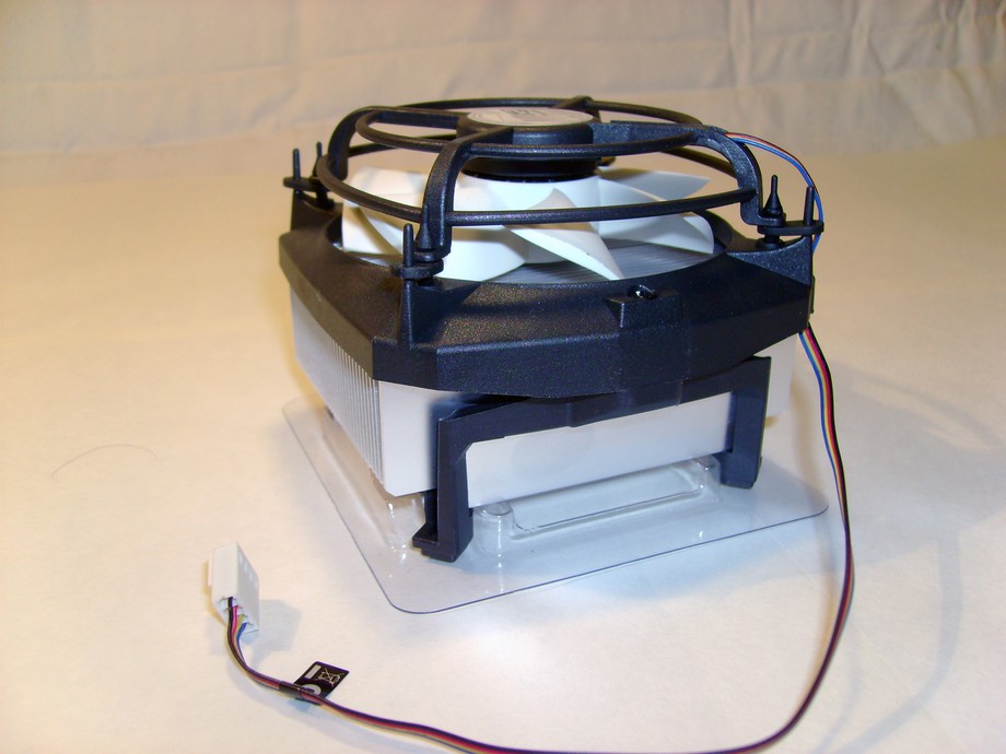 Кулер - интересное решение крепления самого кулера на радиатор, он посажен на резиночках, что дает значительное снижение шума и вибрации на корпус. Вот его фотография сблизка
