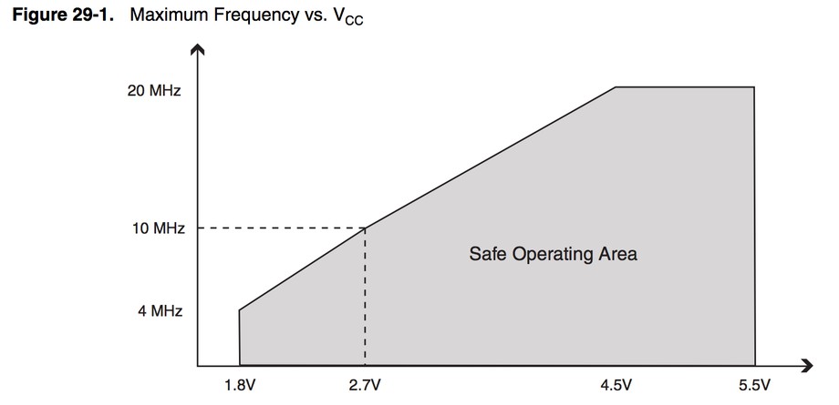 Следующим валуном под ногами было отсутсвие возможности использовать модуль arduino pro mini для датчика, поскольку они бывают 2-х видов - на 16 и 8 мГц. Если полезть в datasheet atmega 328P то можно увидеть, что на частоте 8 мГц Atmel гарантирует устойчивую работу камня где-то на уровне 2.5 вольт, вот картинка: